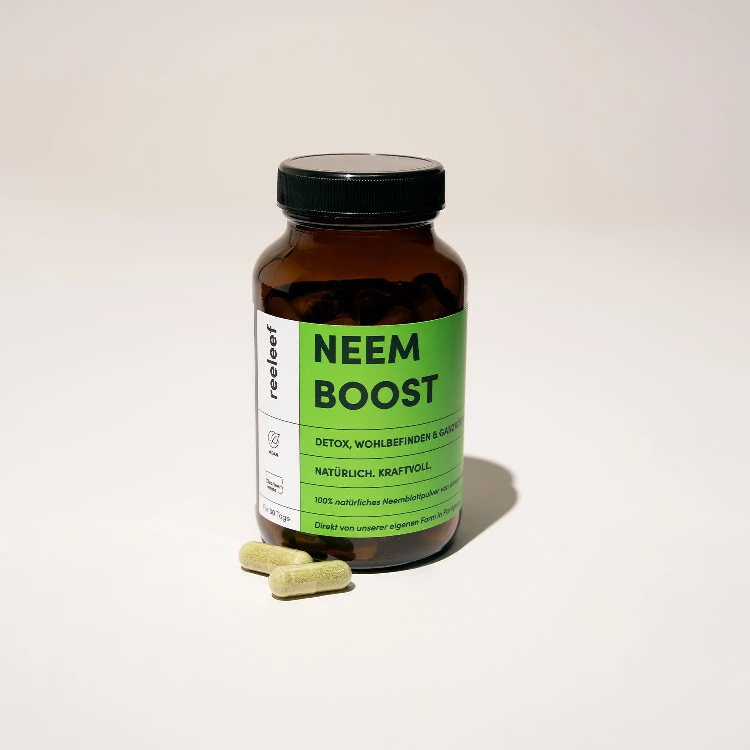 Willkommen bei Neem Boost. Unsere Neem Kapseln stecken voller reinem Neem Pulver – gewonnen aus echten Neemblättern von unserer eigenen Farm in Paraguay. Kein Zwischenhandel, keine Kompromisse. Bei uns wächst Neem so, wie die Natur es vorgesehen hat. Und genau so kommt es auch in deine Kapsel. In der EU verkapseln wir unser Neem Pulver, ohne Zusätze, dafür mit ganz viel Überzeugung. Neem Boost ist unser Versprechen an dich: Natürlichkeit, die wirkt. Von innen. Oder wie wir sagen: natürlich. kraftvoll. reeleef